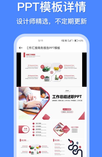 之前人们认为ppt只能在电脑上完成,制作这样的文件是非常困难的,也是非常繁琐的,需要不断的寻找素材以及资料,及时对此无需担心,我们可下载该平台,采用便捷快捷的模式,让你熟能生巧,全面提升制作效率。其中拥有较多的风格,包括经典商务,简约大气等等。