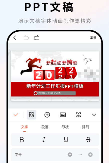 很多企业都已经实现无纸化办公,利用app来办公,相对来说是比较简单的,即便是制作ppt也有着相当简单的功能,选择好模板,将想要展示的视频图片以及文字添加到其中就能制作完成。采用直接用渗透的方式表达信息,让信息传达更加全面,也有着更高的效率。其中有超齐全的模板,是办公的好帮手,可制作word文档以及ppt,有元素专区让你的文件独一无二。