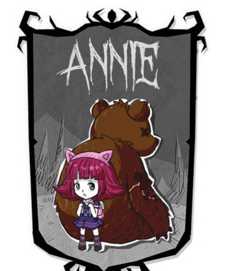 安妮形象是很可爱的,红色的连衣裙小巧的身姿,和自己的伙伴一只大棕熊玩具形成很强的反差。安妮在游戏中属于高输出能力类型的角色。她具有远程魔法攻击的能力。安妮的棕熊伙伴可以为安妮提供护盾,在战斗中也是很实用的。