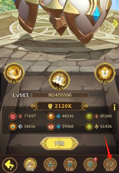 点进养成界面之后,会发现有升星,升级等一系列养成的选项,但最后一个“还原”的选项与前面几个格格不入,而如果想重置伙伴,那么急需要点击还原来进行,还原的时候需要消耗一定数量的金币,以及特定的重置道具,后者可以提前去商人处进行购买。