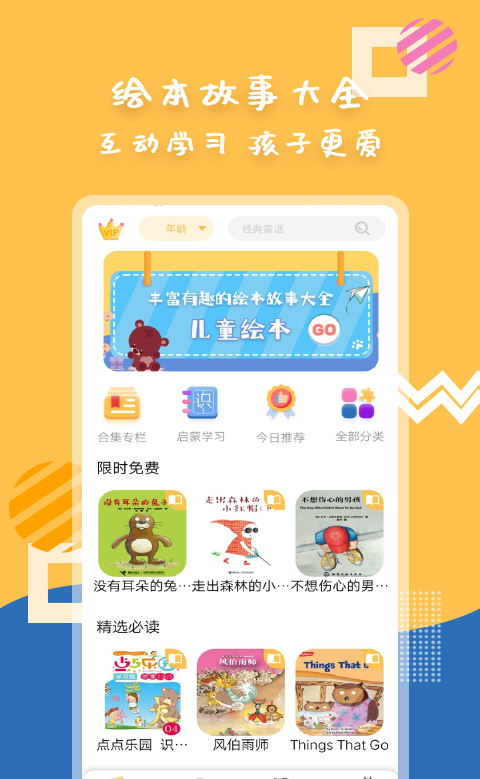少儿阅读启蒙APP,根据每个儿童不同的成长阶段来制定不一样的故事,满足双语阅读的需求,国内外的中文英文绘本资源丰富,互动式的学习闯关检测学习成果。