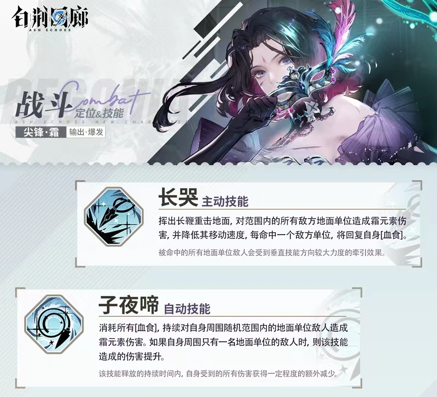 她的自动技能叫做子夜啼,这个自动技能是可以对一定范围内的敌人造成属性的输出伤害,而且造成的伤害是持续性的,如果周围只有一名敌人伤害还会额外进行一个增成,主动技能名字叫做长哭,使用这个技能时她手中的长边会击打地面,从而对敌方站在地面上的所有敌人造成元素的伤害也可以降低她们的移动速度,而且敌方命中之后她自身还可以恢复一定的血量,是一个不错的群体技能。