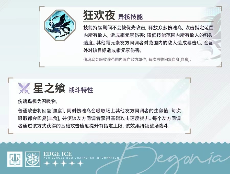 首先来给大家解读一下她在游戏当中是一个什么位置的角色,她是一名主打驯兽爆发型职业定位的女性角色,外观设计上面是十分飘逸并且漂亮的,一头亮眼黑发和浑身暗黑系的穿搭也更加让她增添神秘感,在游戏当中她也是一个非常受到玩家们欢迎并且经常使用的角色,先为大家解读一下她的异核技能狂欢夜,这个技能可以让她再使用技能期间不会被敌方优先进行攻击,同时还能够释放一些伤魂鸟去攻击敌人,并且造成一些元素输出伤害,而且在被攻击范围之内会降低敌方的移动速度。