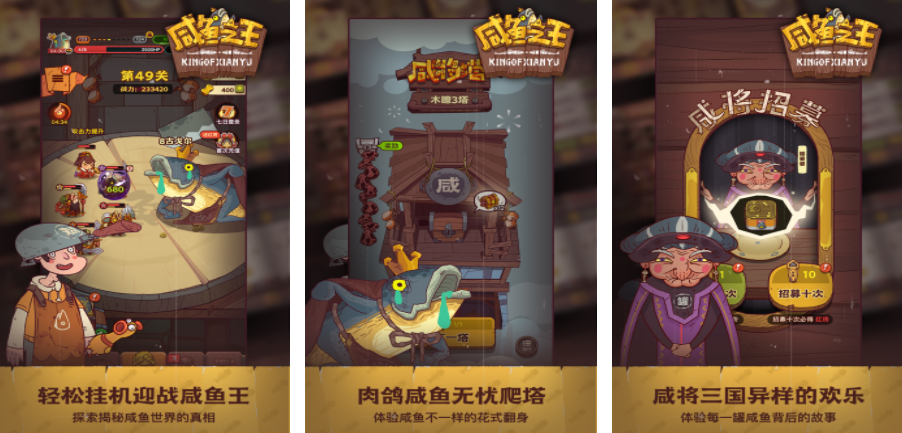 《咸鱼之王》是一款非常热门的三国题材策略养成游戏,这款游戏里的角色全是一条条咸鱼的形象,非常可爱搞怪,许多三国人物都有在游戏中出现,例如貂蝉和孙策等。玩家需要合理安排这些咸鱼角色的出场,来成功对抗外来入侵的咸鱼以及咸鱼boss,这里打boss是可以进行挂机的。游戏中还有爬塔和竞技场等多种玩法等待玩家去探索。