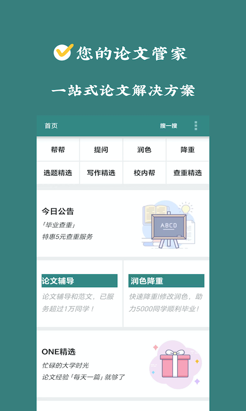 许多即将大学毕业的小伙伴都是第一次写自己的论文,这时候可以来使用论文,帮这款APP来帮助大家完成自己的论文。他提供了论文的各种写作方案。例如论文的选题,写作,润色,降重,查重等等。基本上所有的论文写作问题在这里都可以找到相应的解决方案。