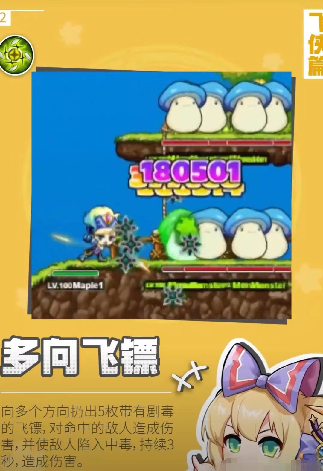 飞侠在游戏当中是一个输出型的职业定位,同时它也是比较受到玩家们欢迎的职业之一,它自身的技能是利用飞镖来对敌人造成多段的输出攻击伤害,而且普通攻击还可以回溯到以前存在的地方进行一个回标输出伤害,这样的话敌人受到的伤害是双层攻击,他的群体技能名字叫做多向飞镖,这个技能也是群体攻击输出技能,并且被命中目标范围之内还有一定的中毒效果,这个中毒的持续效果会延续三秒的时间,这个时候如果玩家们为角色配备了一个叫做刺客印记的东西,还会释放出残影对敌方进行后续追击。
