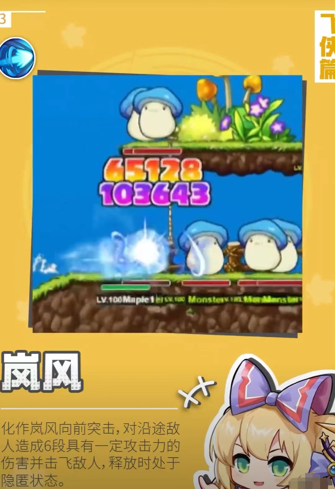 还有一个技能叫做岚风,这个技能可以让他自身化作一道强有劲的旋风并且向前进行突击,这个突击的效果可以对敌方最多层次叠加5层的输出伤害,同时命中的敌人会受到击飞的控制,在控制技能的期间他自身是属于一个无敌状态,不管是用来追击还是用来逃跑,这个技能都是十分实用的,飞侠在游戏当中主打的就是一个输出伤害的定位。