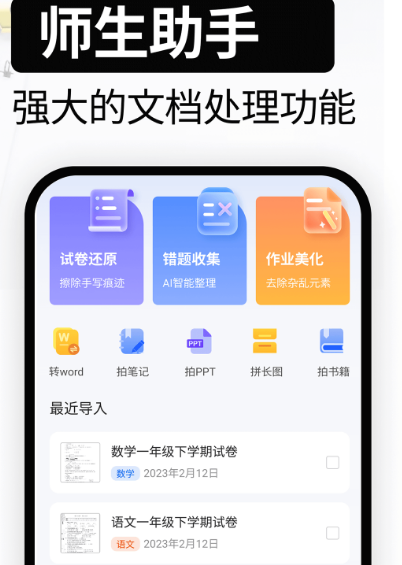一键还原空白试卷将手写笔记完全去除,对于很多老师来说,是教学中的好帮手,更是学生的好帮手,有强大的文档处理工具。另外还有一键整理错题功能,将各种错题重新组合,然后快速巩固。整理试卷之后可发送给其他好友发送邮件,连接打印机实现云端储存以及多设备查看。