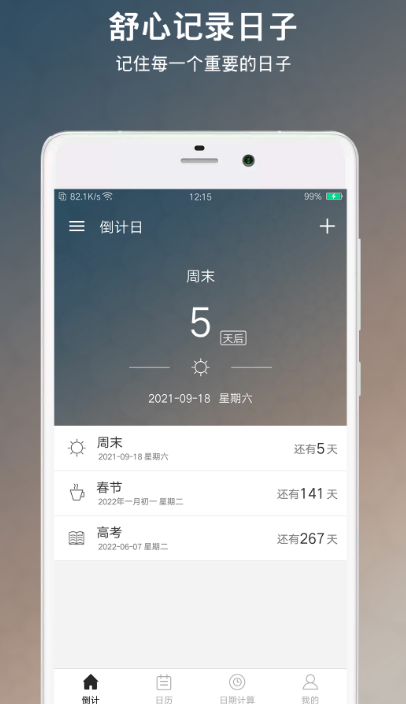 每个经历过高考的学生都知道,在高考倒数日的时候,每一天都需要争分夺秒的度过,也需要好好的备战考试,所以通过这一个软件能让学生精准的了解离高考还有多少天,当然它也是一个可记录生活事件等倒计时的,包括新年倒计时以及生日倒计时等,可了解过去了多少天,剩余多少天,还支持农历日期重复倒数。
