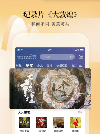 作为央视直播官方呈现的软件,它可以看到有关于cctv的各种电视台,不管是喜欢看中央一台的节目,还是喜欢看中央6台以及电视剧节目的人群,这里的内容非常丰富,其中还能够看到大敦煌、生鲜史这样的纪录片,也可看到山水间的家,你好生活这样的综艺节目。