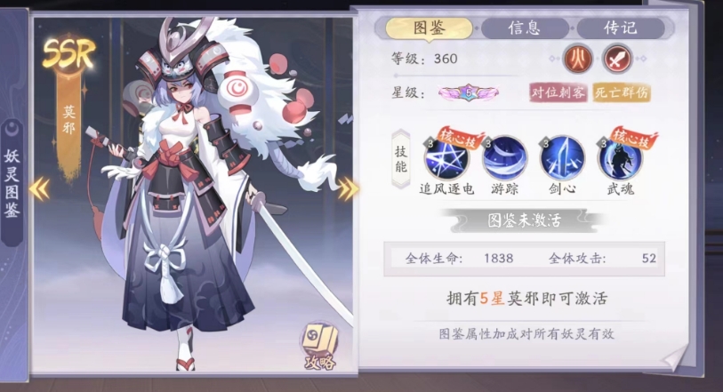 莫邪:她是非常克制刺客的一个群伤角色,两个核心技能“追风逐电”和“武魂”都有着强劲的效果,其中“追风逐电”能够对单体敌人造成三段伤害并降低其怒气,同时使用这招时自身会进入潜行并回复血量,“武魂”的话则可以在攻击半血以下目标时对其追加一段额外伤害,这大大提升了莫邪的斩杀能力。