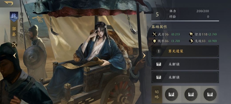 第三个就是郭嘉,这个角色作为一个冲锋陷阵的选手绝对不错,在游戏中目前想要组成一些输出比较高的角色,大家就可以选择使用郭嘉,郭嘉不仅是可以在上面单独使用,还可可以跟孙权等等强力角色一起搭配使用效果更佳。