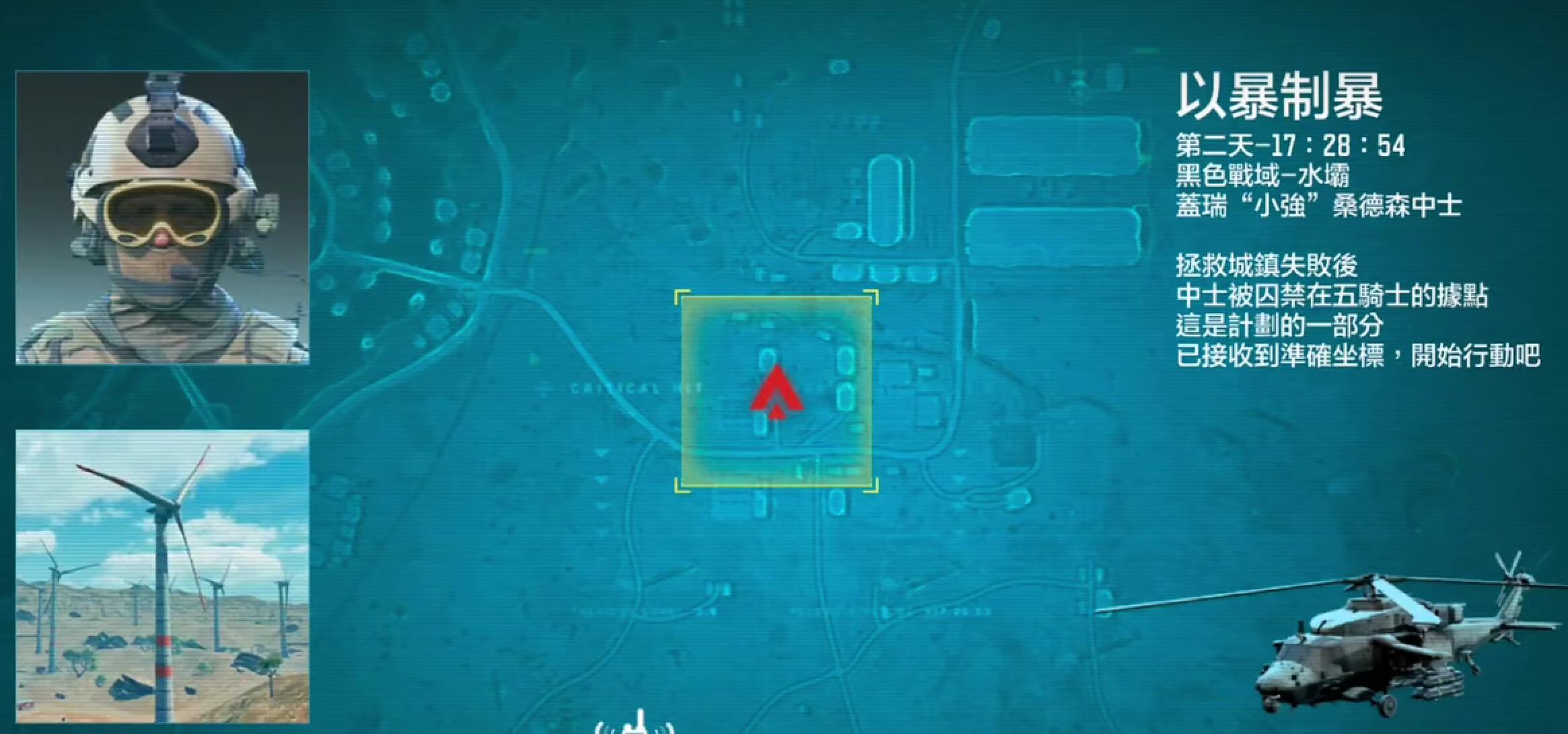 玩家们在游戏中会根据其中剧情的进程来解锁不同的小任务,相较于传统模式的第一人称射击来说,在战役模式里玩家的操作可以变得更加多样化,例如在直升飞机上驾驶直升飞机来进行作战,不仅要保证自己进攻的准度,同时也要自己操作直升飞机的行动路程,去躲避敌方直升飞机的进攻。