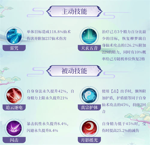 天玄五音是柳梦离的绝技,可以对己方三个精力百分比最低的目标进行治疗,恢复量与柳梦离的仙术攻击力有关,并且有一定概率给己方随机单位恢复两格能量。柳梦离的战斗技能可以说是非常稀有的奶妈技能,既能提供一定的输出,又能给队友提供强大的支援。
