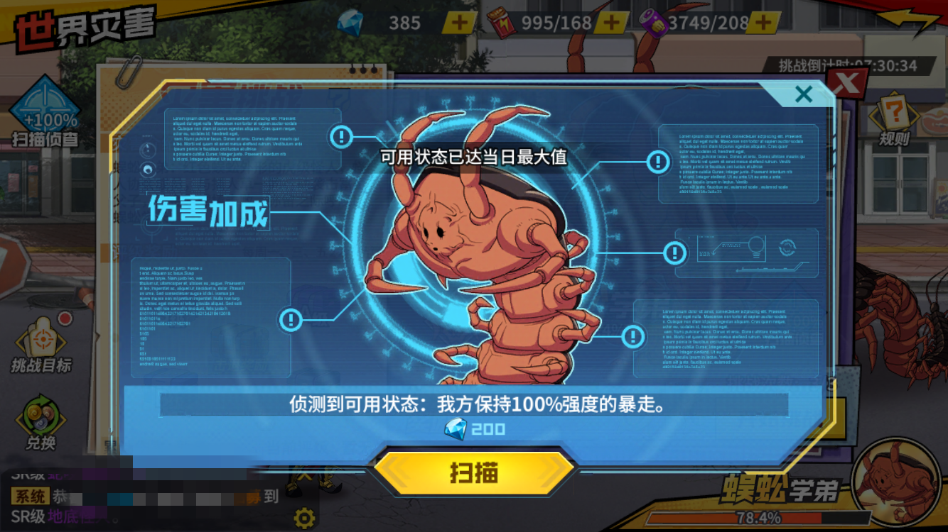如果玩家们想要在灾害活动中获得更多的收益和额外的伤害效果,就可运用系统上侦测机制来提高角色的伤害值。每天都可以扫描boss3次,但是需要消耗一定数量的钻石,就可以增加角色的暴走效果。