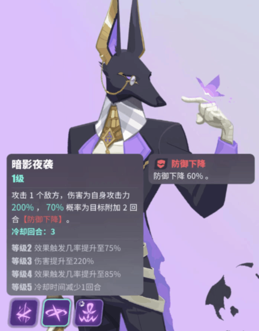 首先是他的普通技能暗影夜袭,虽然不能攻击敌方全体,只是一个单体技能,但是能够对敌方造成自身攻击力200%的伤害,当技能等级提升到三级的时候,就能够造成自身攻击力220%的伤害,这是一个非常有效的攻击手段,基于这个机制玩家们在培养阿努比斯时就需要着重提升他的攻击力,这样才能够在最大程度上发挥出暗影夜袭的强势之处。