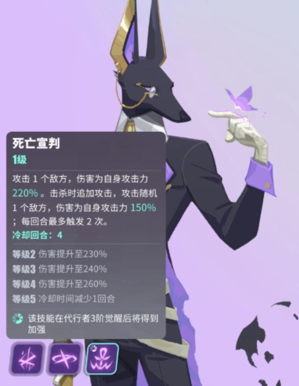 再就是阿努比斯的大招死亡宣判了,看到这个霸气的名字就能知道这个技能不一般了,它在初级的时候就能够对敌方个体造成220%攻击力的伤害,同时还有着一个比较强的机制,就是玩家如果使用这个技能击败敌人的话,就能够再随机攻击另一名敌方角色,造成的伤害为自身攻击力的150%,通过这个机制也能看出阿努比斯有着比较强的残血收割能力,不过需要注意的是这个效果最多只能触发两次哦,所以在面对较多的敌人的时候还是会显得有些吃力的。