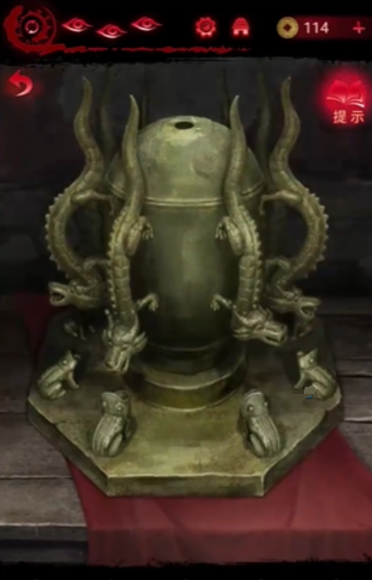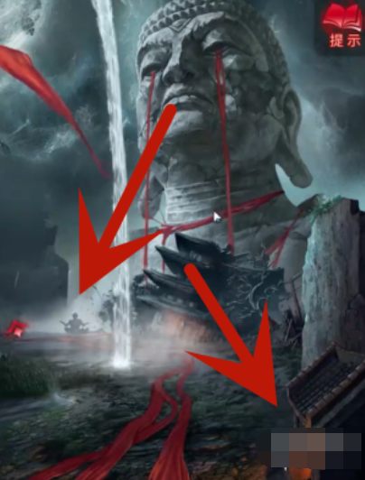 在佛像的顶部点击,触发剧情,然后在右下角拿到灵牌,左边的石像背后有一张纸,点击查看,获得线索。