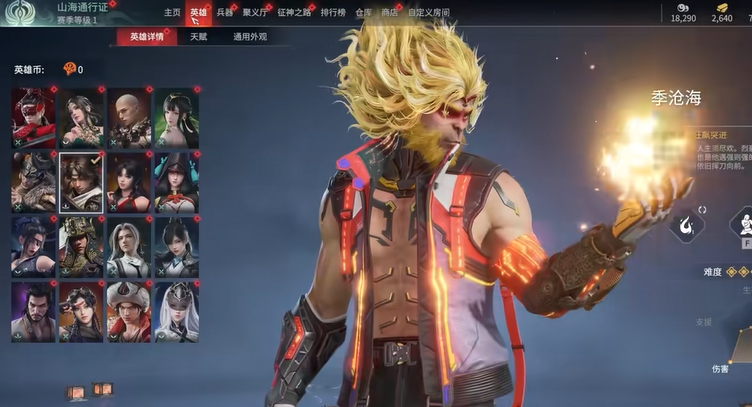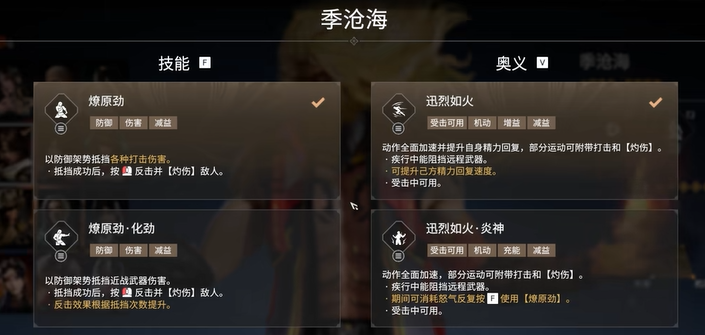 首先要给大家解读的第一个角色叫【季沧海】,这个角色在端游中也是经过了好几次调整,就是因为强度太高的,不管是技能伤害还是机动性都是非常的高的,小虎斑们更加愿意在游戏中叫他火男,也是因为自身的技能伤害都是跟火有关系,在对局中,玩家们可以选择携带技能【燎原劲】,这个技能在对付一些近战突击能力十分强的,如武田或者特木尔等角色有很强的压制能力,开启技能后,自身就会进入一个格挡状态,在屏幕中心有一个格挡数值,当数值满的时候,就可以触发反击效果,对敌人造成伤害后,并轻微造成击退效果;