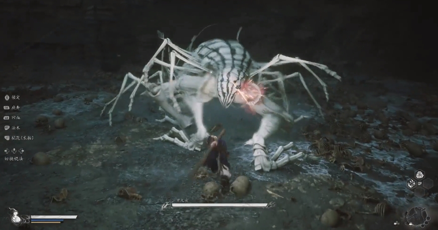 区域的亮度略低,周围非常昏暗,同时有着很多头骨散落在附近,这关的boss是“百足虫”,它出现的方式非常突然,会直接从随机一个方向跳出来,落到主角面前的时候还会掀起一阵震动,其攻击方式并不算多,主要还是靠近身撞击和突刺,玩家利用好闪避可以轻松躲避,其血量属性也不多,基本上硬刚都可以刚过。
