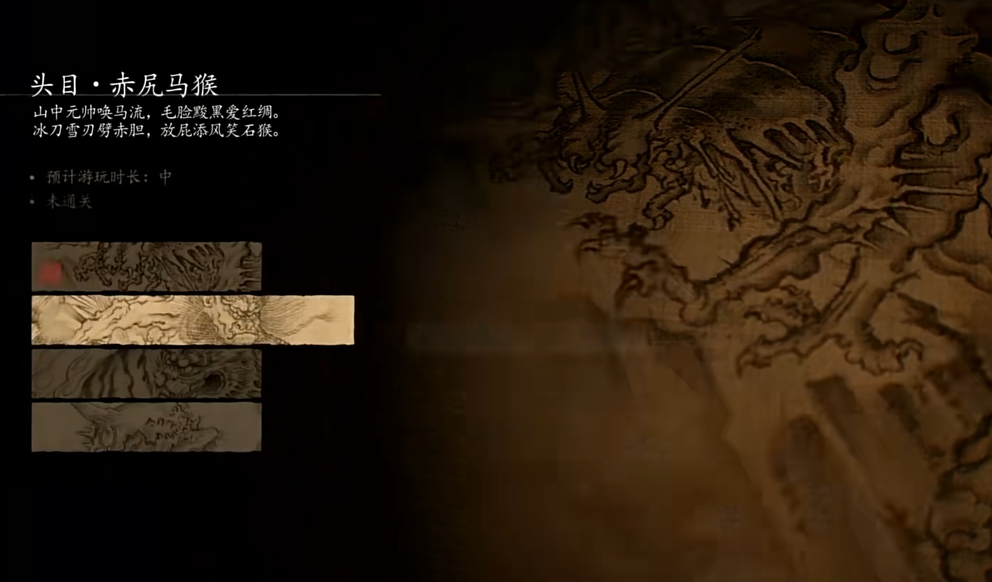 第二关则是在一片雪地之中,雪地里有许多道人模样的小怪,但他们只会在你靠近后才开始行动,就像是被贴了符的僵尸一样,但这些怪伤害低,移速慢,甚至都不用刻意去战斗就能闯过,这关的boss与主角一样也是只猴子,不过是更加矮小狰狞的“赤尻马猴”,它手持大刀,能通过突进来与敌人进行近身交战。
