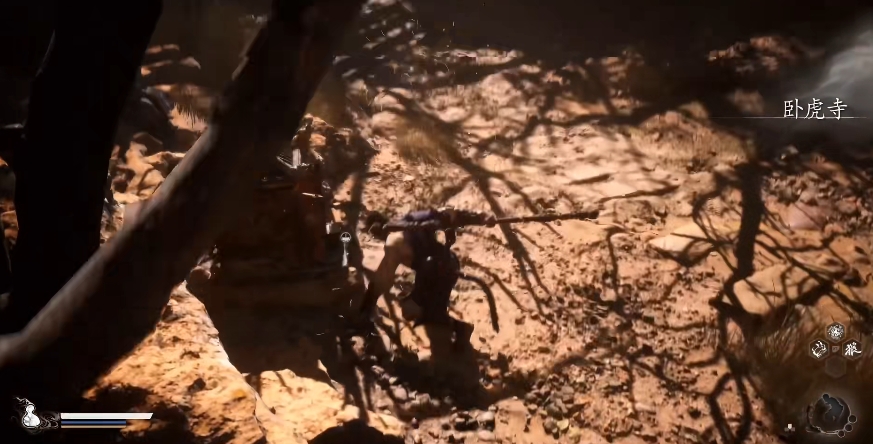 第三关玩家会来到一处遍布黄沙与枯树的场景,不过这都属于前置的场景,主角很快就会见到一座辉煌的庙宇,进入庙里可以看到正在茹毛饮血的boss“虎先锋”,而虎先锋也正是这关的名字,通过与其对话可以得知它已经吃了不少人,所以见到玩家后也是不由分说就开始了攻击,其连打和控制手段很厉害,因此不少线下试玩的玩家都在这里失败。