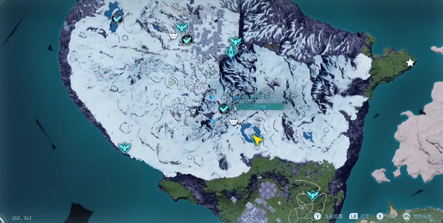 首先要来到帕洛斯岛屿上面,之后前往左上角的冻土区域然后去往不溶湖传送点进行传送,解锁传送点后,到达其左上角的一个悬崖,然后从进入旁边的洞口从而触达隐藏区域,来到区域最里面就能够见到黑月女王。