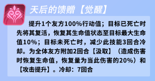阿尔比尔的最大亮点是她的觉醒技能,这个技能可以在发动后为友方一个单位提升100%的行动值,这意味着该单位可以立即获得一个回合,拥有绝对的先手优势。这个技能可以用来打断敌方的技能,或者给我方的核心输出角色创造更多的输出机会。而且,如果在提升期间该单位死亡的话,还会触发另一个效果,这个效果可以让我方全体获得一个吸血buff,这个buff可以让队伍中的其他成员在攻击时回复生命,增强了队伍的生存能力。