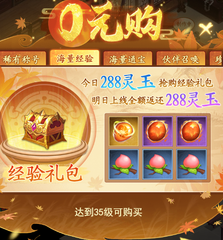 除此之外,在客栈玩法中,小伙伴们可以看到很上方有很多不同的活动,其中有一个【零元购】的玩法,小伙伴们等级达到35级的时候,可以花费288点灵玉来购买经验礼包,可以领取到金蚕王,菩提果和蟠果,这些都是升级所需要的材料!客栈中还有一个比较快速获得经验的【客栈外卖】玩法,这个玩法需要小伙伴们完成四次送外卖的任务,完成后,就可以获得四种不同的奖励,也是为了快速升级,前期必须要去完成的!