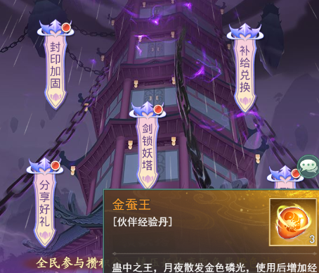 玩家们可以选择去参加游戏中的【锁妖塔之变】,这是一个全服玩家都可以参加的活动,玩家们每获得一点全民积分的话,就可以提供1点贡献度,达到一定数值时,就可以领取到贡献度奖励了!而且达到4000点的时候,好可以领取到【菩提果】,后续还可以领取到【金蚕王】,这两个物品使用后,可以获得大量的经验,服用一次最少是可以升到5级的;在这个玩法中,还有一个【剑锁妖塔】的区域玩法,玩家们可以根据小队打出来的伤害,只要玩家们伤害打出20万的时候,就可以领取到最终的宝箱,宝箱当中含有大量的经验和银币奖励!