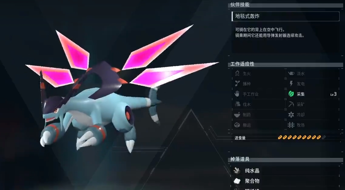 第一个推荐的是空涡龙,这是后期最全面最强大的一个帕鲁,它本身有着超强的属性,无论是战斗还是采集都很优秀,当然,飞行速度也是一流水准,所以后期的跑图坐骑它一定是首选。