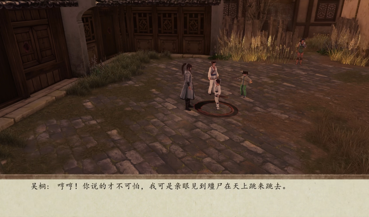 从对话中得知,穿白色衣服的小孩叫吴桐,他在晚上上厕所时看到了一蹦一跳的僵尸。他也很好奇这僵尸究竟是什么。主角团中的萧复听到了僵尸立马就联想到了和他有灭门之仇的槐尸身上,打算一探究竟。
