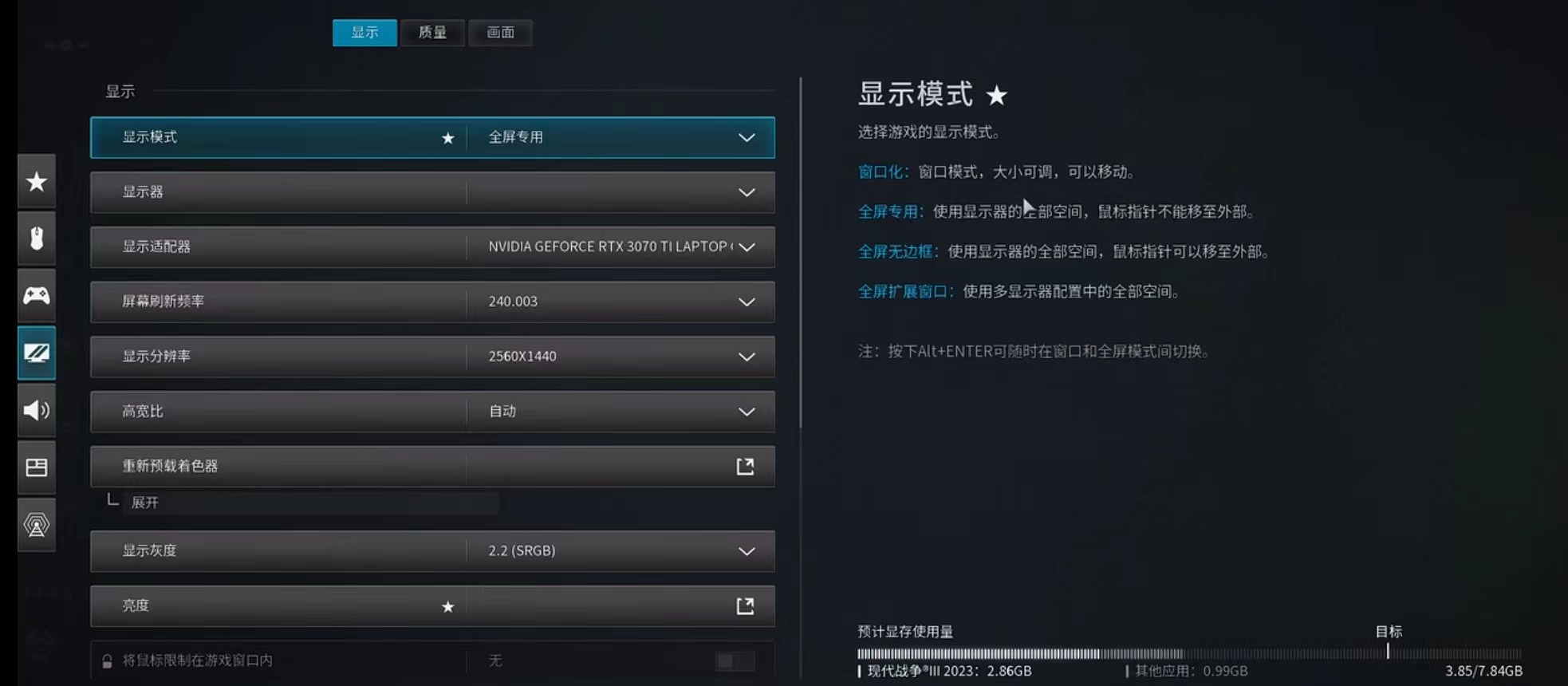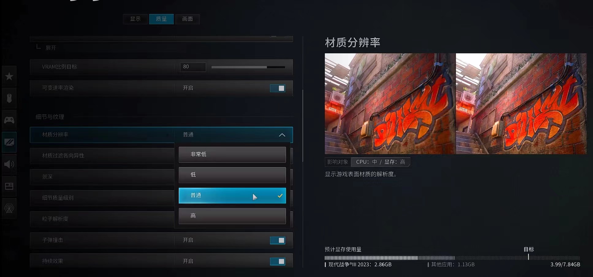 第4步,最后玩家需要选择材质材质分辨率,调整整体画面的材料解析度,例如,武器撞击特效,粒子解析度,场景深度等等,所有的选项调整完毕后,记得要选择保存选项。