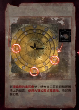 和老肖对话,与房间里的蜡烛逐个互动,可以拿到铃铛还有面具,这时候再次和老肖对话,能给我们一个无面铜人。拿到之后再下到闻谕殿,可以取出神龛外观箱子上的鲁班尺。再去闻谕殿常经理的宙晷盘,再去看老肖的日记和浮雕墙的线索,可以用火镰去互动对应顺序的蜡烛,这时候进入唐朝视角。