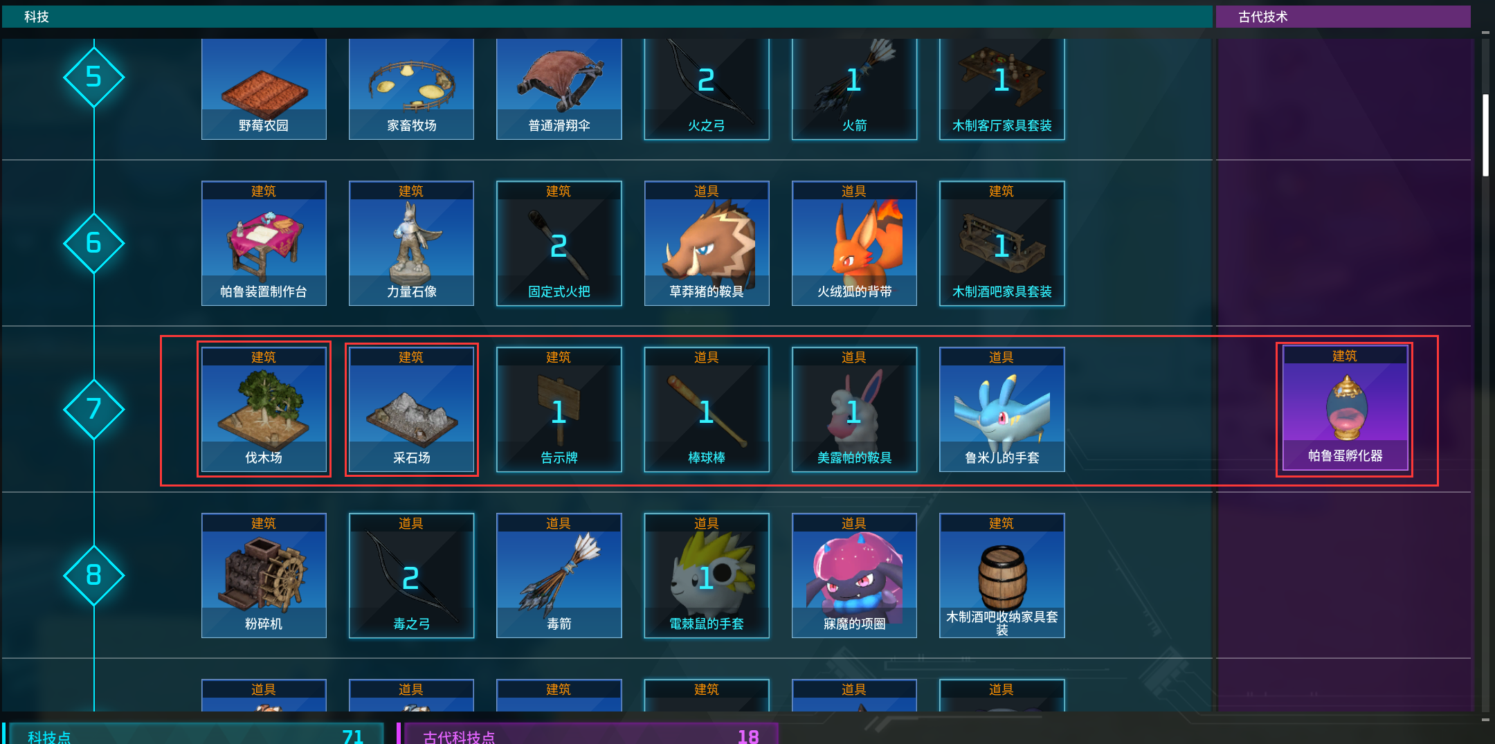 幻兽帕鲁7级科技道具我们今天就分享到这了,小编推荐大家必点伐木场、采石场。而古代科技必点孵蛋器。如果在前期科技点有限的情况下,大家在这几个选项上也千万不要吝啬,优先点出将极大提升游戏效率。