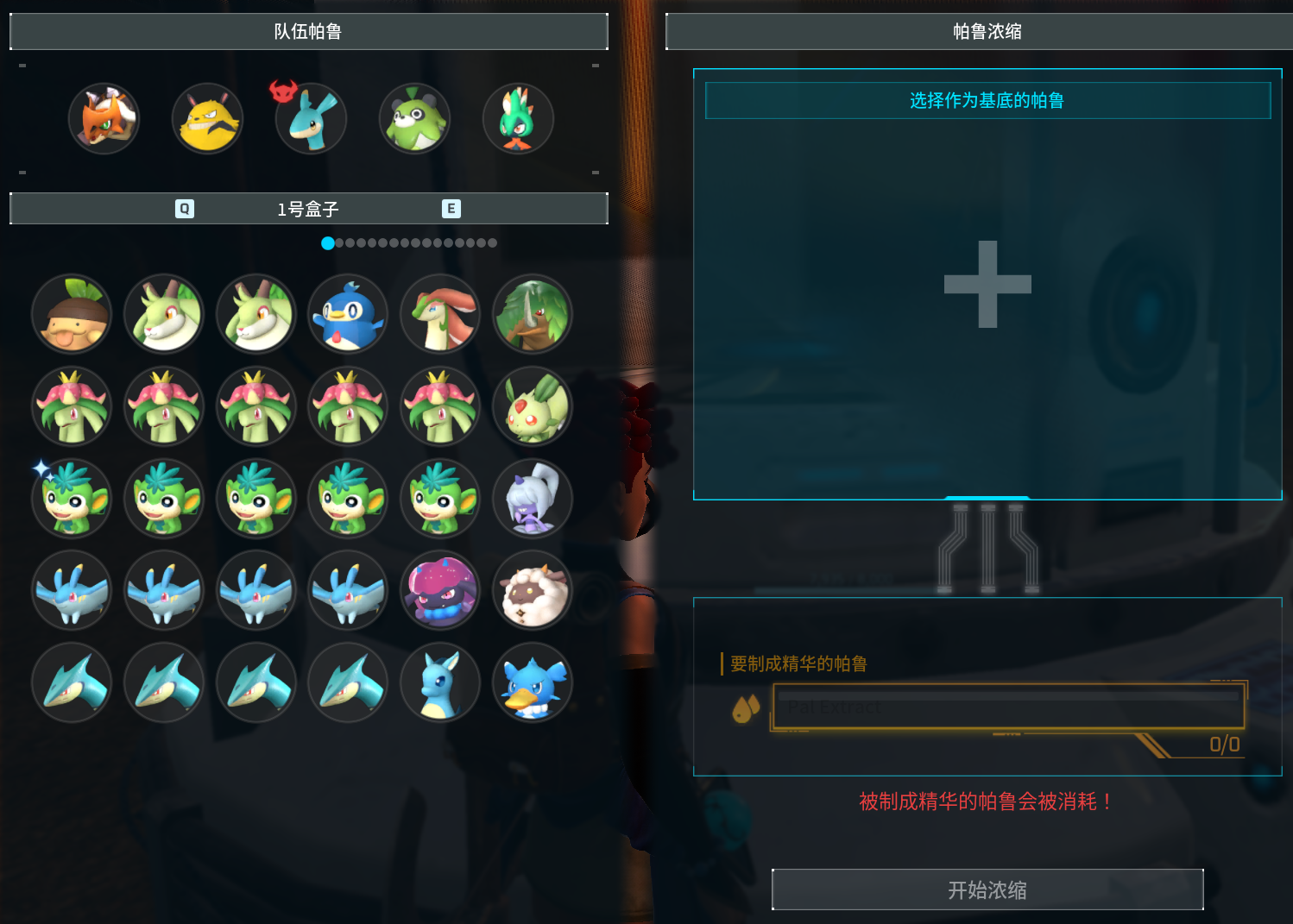 放置好之后就可以准备一些同种的帕鲁,用来进行浓缩合成。这里面的帕鲁数量是要求很高的,但是对特性没有要求,在浓缩机中红色特性也不会遗传所以大家可以放心浓缩。数量方面培养一个四星帕鲁的话保守估计需要100余只同名帕鲁,但是为了兼顾终端的帕鲁容量,大家可以随捉随压缩,但是每次升级都需要一次性完成。