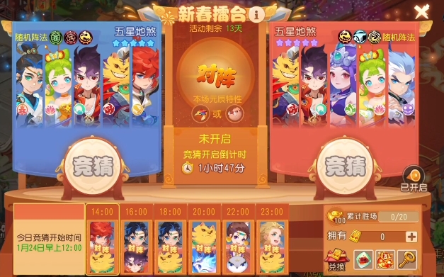 新春擂台:这个则是一个带有竞猜性质的活动,从1月24日开始移植到2月5日期间每天中午十二点都会开启竞猜,所竞猜的队伍获得胜利后即可获取珍稀的升级资源。