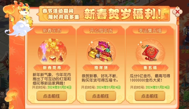 新春贺岁福利:活动期间会开放“新春花市”,“囤年货”和“集五福”三种奖励,花市里可以买到具有春节气息的各种新品家具,年货则是通过购买年货以此获取五福卡,集齐五福后则能够参与五亿金币的瓜分。