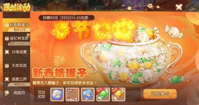 新春糖罐子:这个是一个带有氪金性质的活动,需要氪金购买糖果存入糖罐子,之后能够存放糖果的数量来获得对应的金币,银币和仙玉奖励。