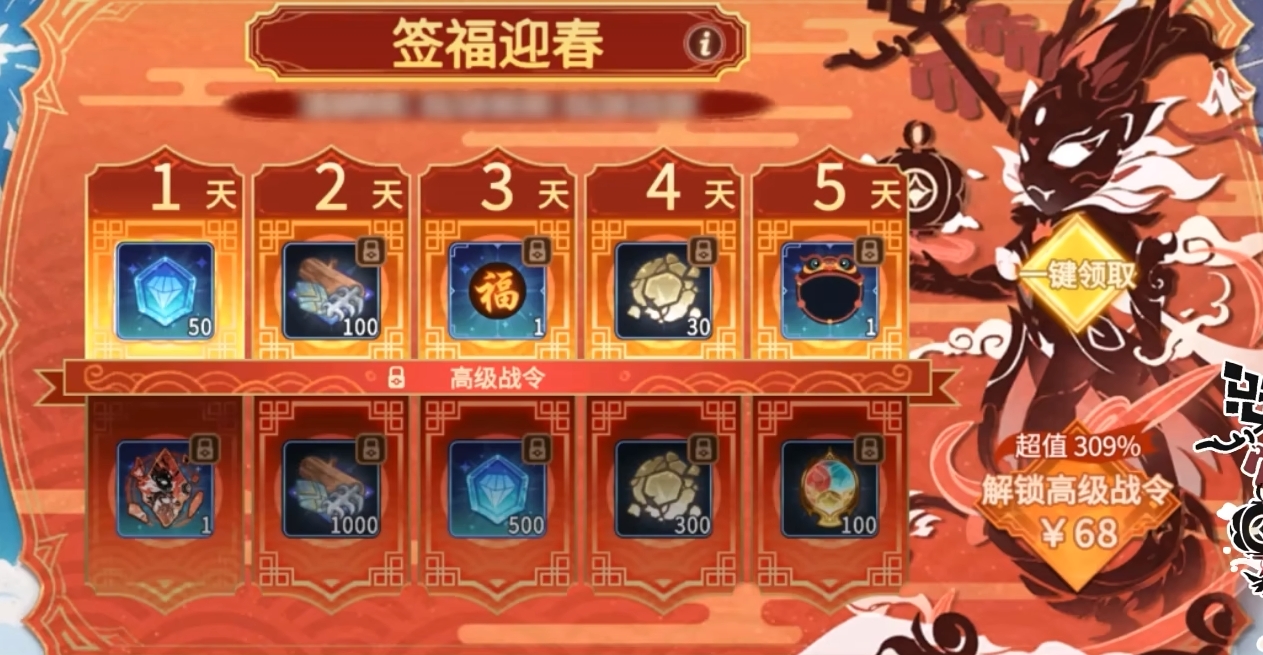 第一个更新内容就是它的“签福迎春”战令,这个战令采用了非常浓郁的春节风格,不仅可以从里面获得许多带福字的道具,而且如果花费68解锁了高级版本,还能直接领取一套白昼的守岁形态新衣。