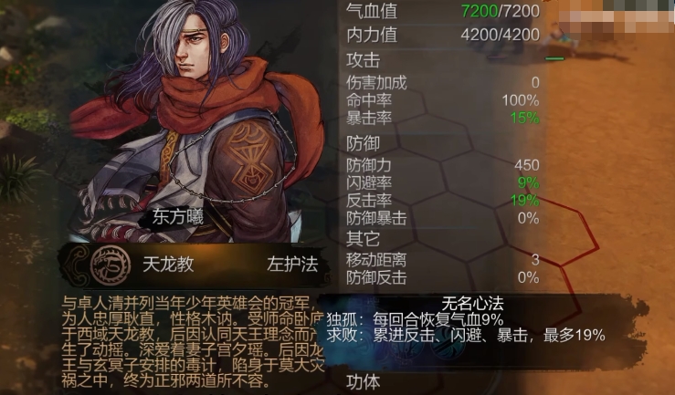 东方曦:这是一个持久战非常厉害的角色,他自带的无名心法可以持续回复气血,同时随着战斗深入可以不断获得额外的反击,闪避和暴击属性加成,可以说是越战越勇了。