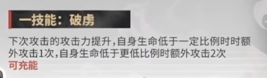 一技能的话则会强化下次普攻,以此获得额外攻击力提升,血量低于一定比例,还能令下次攻击时额外再攻击一次,低于更低比例时则变为额外攻击两次。
