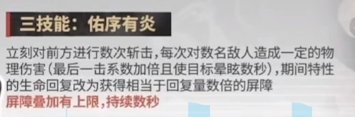 三技能是进行多次连斩,可以对多名敌人造成一定物理伤害,同时最后一击还会额外提升加成的倍率,并使目标陷入眩晕,值得一提的是这期间特性所提供的回血还会变为提供数值更强的屏障。