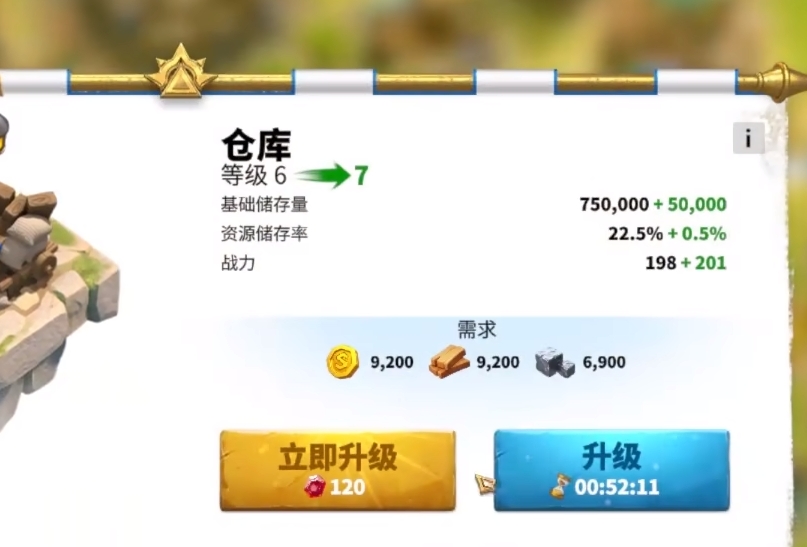 第二个技巧就是要多积攒宝石,宝石积攒起来之后可以用于加速升级自己的第二建筑,也就是仓库,因为它能够增加你的基础储存量与资源储存量,这相当于为你的部队提供了更多后勤保障。