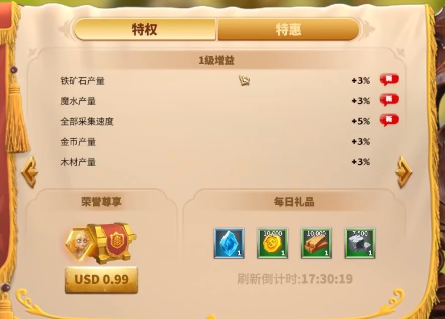 再就是如果有条件的话,新手时期也可以购买一下它的特惠,特惠会每天都提供一定的资源,此外,还能够给予你一定的增益,这些增益囊括了大部分的生产工作,可以让你生产过程中获得更多的资源。