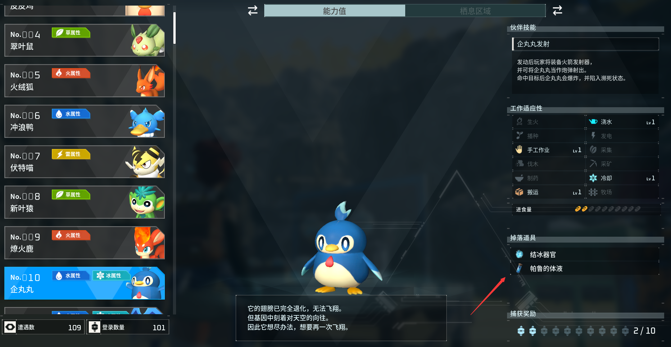 效率较高的话,小编建议大家试试010号的企丸丸,这个帕鲁的体液掉落率比较高,而且不太难打败,适合前期的玩家。任意一个水系帕鲁分布密集的地点都能找到。这样可以节省寻找目标的时间,也可以提高刷取帕鲁体液效率。