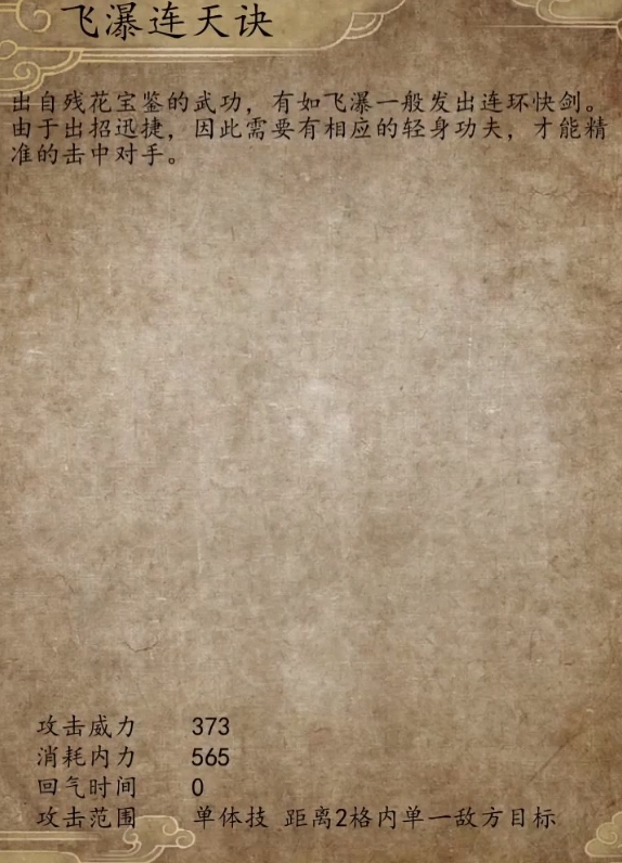 第三个推荐“飞瀑连天决”,这是一个威力足足有373的武功,而且招式非常迅捷,不过学习它需要你的角色拥有一定的轻功水平,这招本身是一个单体大杀招,单挑的时候非常好用。