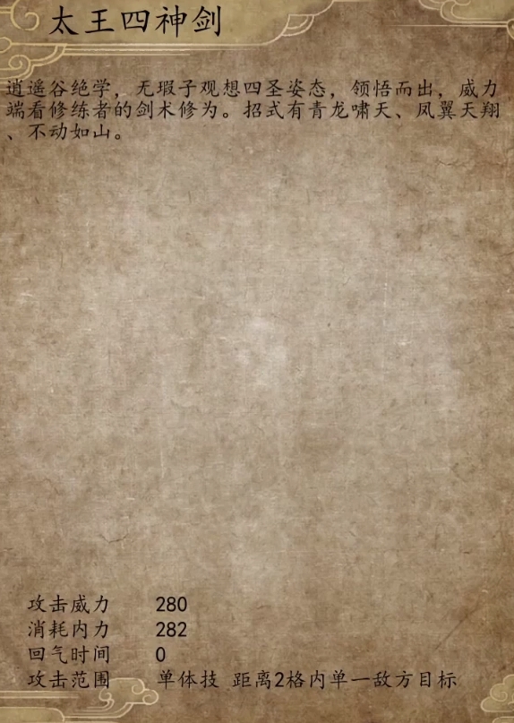 最后推荐“太王四神剑”,这是逍遥谷的绝学,融合了多种精妙的招式,280的威力加上不俗的攻击防卫能让你在初期展现出强劲的压制力。