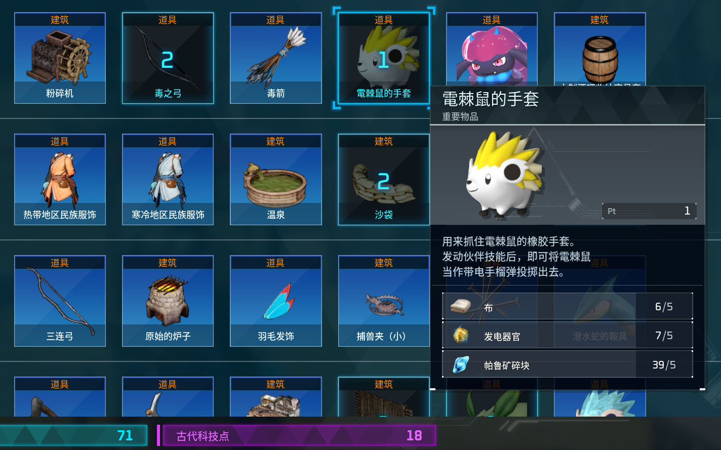 但是这里小编要解读一下雷棘鼠的特殊用法,就是我们可以通过帕鲁制作台来制作已经解锁的雷棘鼠手榴弹,也就是俗称电击雷的物品,能够造成一次性的伤害及麻痹效果,使我们后期捕捉boss的神器之一。但缺点就是雷棘鼠也变成一次性的了,需要多次捕捉,而且占用一个帕鲁格子。但是大家完全可以玩一个人物主c流就是增强我们自身实力,然后带五个电刺猬手榴弹来进行输出。