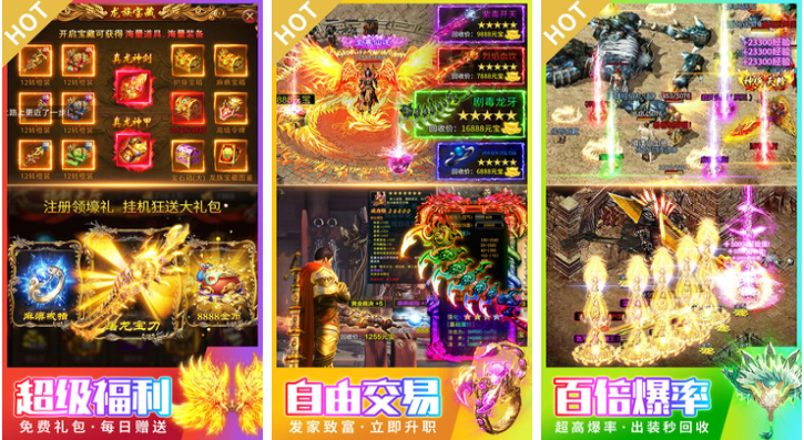 这款传奇游戏凭借极高的爆率在传奇游戏行业中脱颖而出,即使玩家击杀一个普通的小怪物都有几率爆出神装哟!经典复古的登录界面和帅气的角色形象让本作名声大噪,畅爽的游戏体验与超高的爆率让本作更具可玩性,圣兽领域和巅峰争霸等独创的联机玩法增加了本作的可玩性,全新的游戏系统和浮夸的特效表现令人难以忘怀。